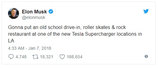 Современный drive-in Илон Маск собирается открыть на зарядной станции Supercharger в Лос-Анджелесе. Возле нее построят ресторан. На внешней стене заведения установят большой экран. Из него будут транслировать «лучшие сцены за всю историю кино». Таким образом можно будет, как в кинотеатре под открытым небом, наслаждаться просмотром фильмов.